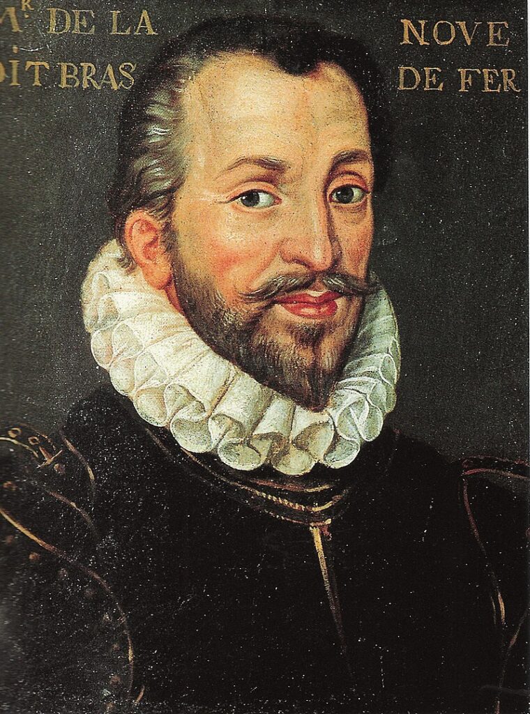 François de la Noue III, haut et puissant seigneur, né à Nantes en 1531, surnommé » Bras de Fer », parce qu’ayant eu le bras gauche emporté à la prise de Fontenay, en Poitou, il s’en fit mettre un en fer. capitaine de 50 hommes d’armes, mémorialiste et écrivain. Passé à la réforme, il resta cinq ans prisonnier des espagnols méditant ses Discours politiques et militaires (1587). « Il se voulait davantage un grand homme de bien qu’un grand homme de guerre. » (Henri de Navarre) Pendant les guerres de la Ligue, il commandait l’armée du prince de Dombes. Le 30 juin 1591, il conduisit l’armée Royale à Quintin. Vers le 4 juillet, après une escarmouche avec les chevaux légers et les arquebusiers du duc de Mercoeur, l’armée regagna Quintin. Puis elle partit pour Lamballe. C’est le 18 juillet que le capitaine François de la Noue fut blessé d’une balle d’arquebuse en allant reconnaître les défenses du château de Lamballe, blessure dont il mourut à Moncontour le 4 août.Ce personnage avait la réputation d’un grand général, d’un habile négociateur, d’un excellent politique, d’un bon citoyen et d’un homme vertueux. Il avait épousé Marguerite de Téligny, fille de Louis, tué à la Saint-Barthélémy et de Louise de Coligny. Celle-ci se remaria à Guillaume de Nassau, prince d’Orange. François eut pour descendance: